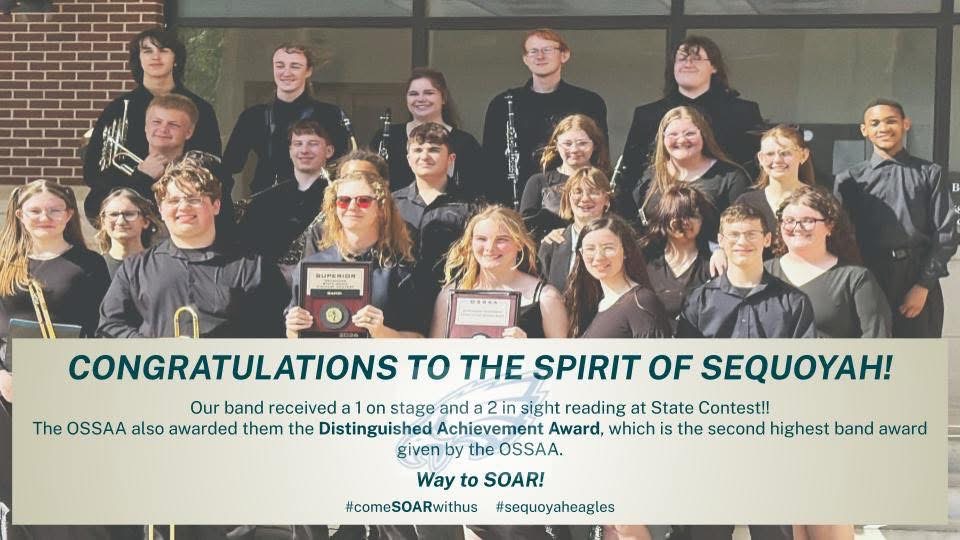 The Spirit of Sequoyah Band received a 1 on stage and a 2 in sight reading at State Contest! The OSSAA also awarded them the Distinguished Achievement Award, which is the second highest band award given by the OSSAA. Way to SOAR!